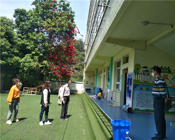 4月28日上午,江安县城北督导组督导员周厚彬、赵诗华一行来到井口中心幼儿园检查开学复学准备工作。